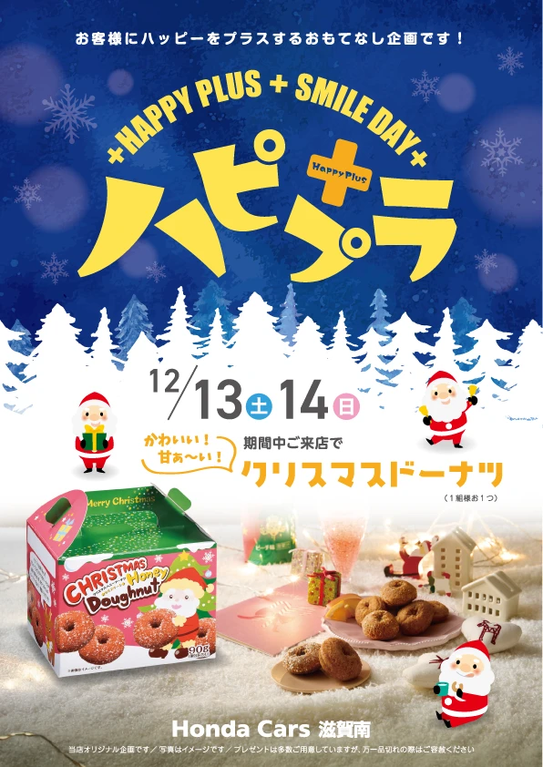 2025-11-25 当店オリジナル企画「ハピプラ」2025年12月は12/13(土)~12/14(日)の2日間開催です! 期間中のご来店で、かわいくて甘ぁ~い! 🎄クリスマスドーナツ🎄 をプレゼント♪ ハピプラはハッピー+スマイルデーお客様にちょっぴりハッピーをお持ち帰りいただくおもてなし企画です♪ ぜひお近くのホンダカーズ滋賀南へ✨ 最寄りのお店へ ●プレゼントはお1組様おひとつとなります